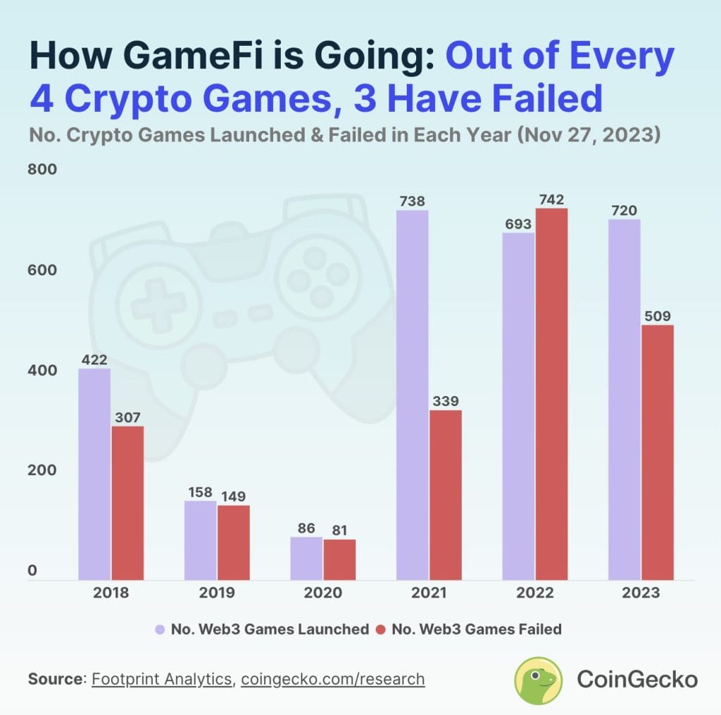 First, it was ICOs, then NFTs, P2E, and now Web3 gaming. This isn’t an exaggeration: Data from Coingecko covering 2018 to 2023 shows that 75% of Web3 games launched turn to dust within the first year. And while the 2024 report is not yet finalized, it’s unlikely that the numbers will be any better.