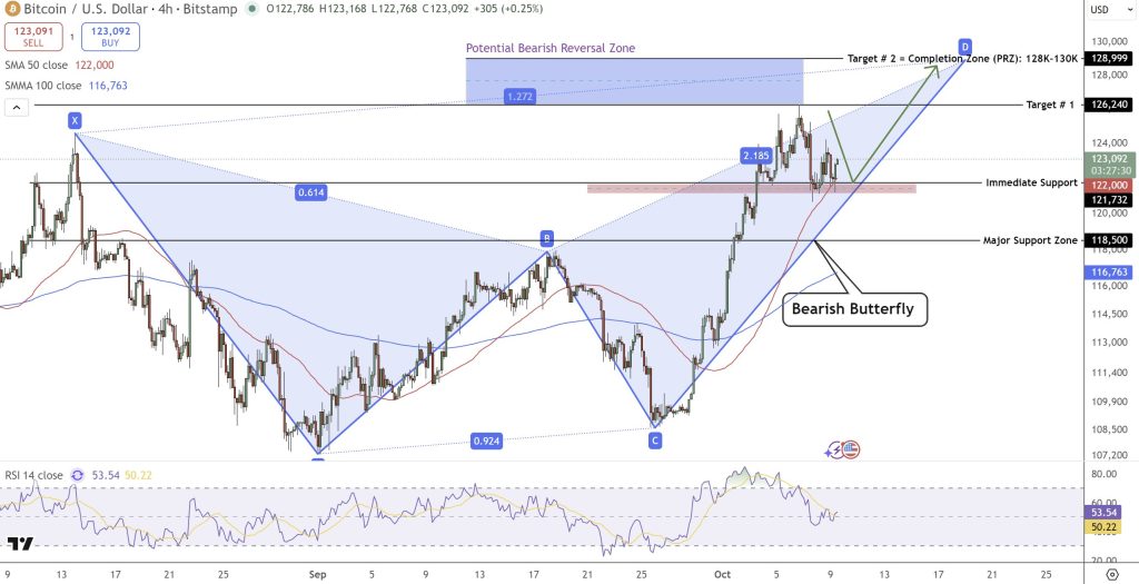A decisive breakout above $126,240 would open the path toward $130,000, completing the harmonic pattern and marking a likely short-term resistance zone. Failure to hold $122,000 could trigger a pullback toward $118,500, aligned with the channel’s lower boundary.