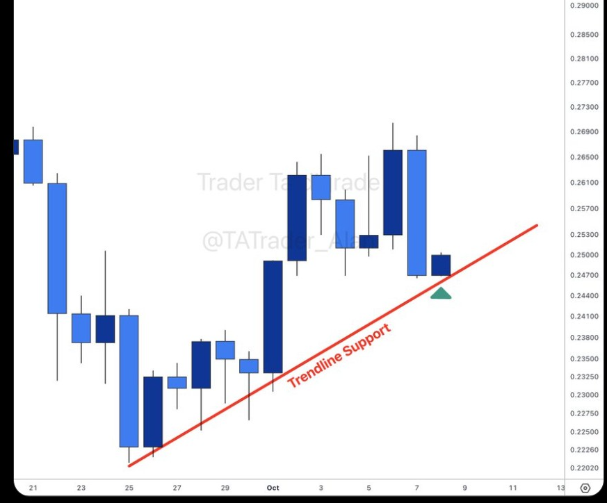Dogecoin price is stabilizing after a period of high volatility, holding above $0.24 support, which signals accumulation. According to chart analyst Trader Tardigrade, DOGE’s daily trendline support is intact, with early signs of a rebound toward $0.26–$0.27. The analyst noted that previous rebounds from such levels triggered 10–20% rallies.