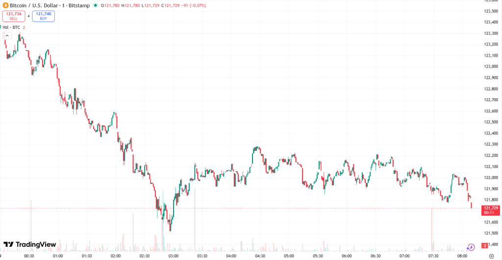 At the time of writing on Thursday morning, BTC trades at $121,793. Earlier in the day, the price surged to the intraday high of $124,072, before dropping to the low of $121,432 and then recovering to the current price.
