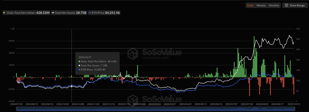 The total net asset value of Ethereum spot ETFs fell to $28.75 billion, equal to 5.56% of Ethereumâs market capitalization. Cumulative inflows across all Ether ETFs now stand at $14.48 billion, down from $15.08 billion earlier in the week.