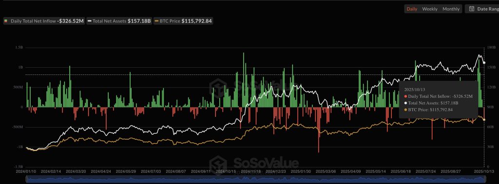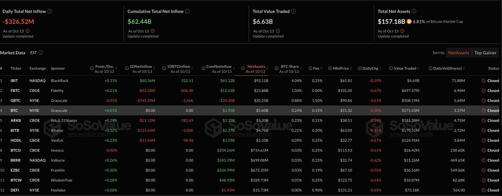 As of October 13, the total net asset value of Bitcoin spot ETFs stood at $157.18 billion, representing 6.81% of Bitcoinâs total market capitalization. Trading volumes reached $6.63 billion for the day, underscoring elevated activity amid market uncertainty.
