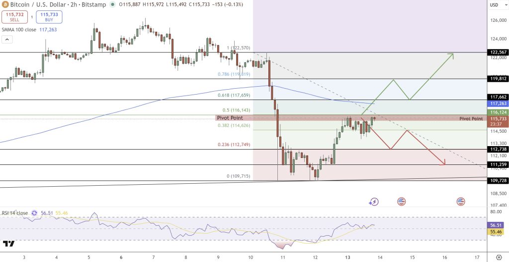 Technically, Bitcoin trades in a tight consolidation channel between $112,700 and $117,600. A breakout above $116,100—the key 50% Fibonacci retracement—could trigger renewed bullish momentum toward $119,800–$122,500.