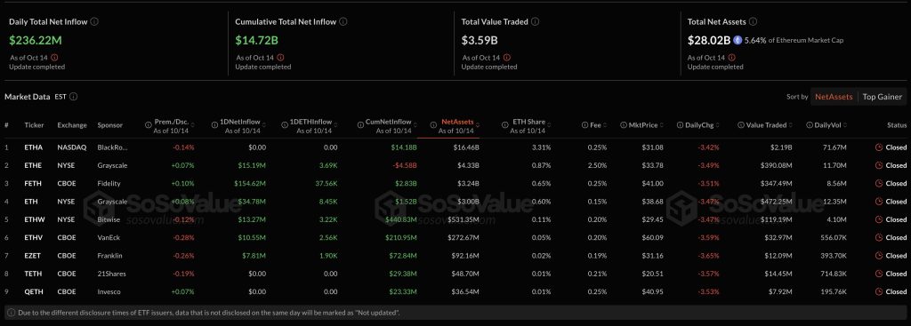 Total assets under management across Ethereum ETFs climbed to $28.02 billion, equal to roughly 5.6% of Ethereum’s market capitalization.