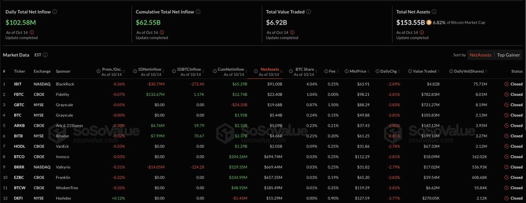 As of October 14, Bitcoin spot ETFs collectively hold $153.55 billion in assets under management, representing 6.82% of Bitcoin’s total market capitalization.