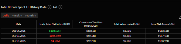 After one of the most turbulent weekends in months, U.S. spot Bitcoin and Ethereum exchange-traded funds (ETFs) staged a dramatic turnaround on October 14, recording a combined net inflow of $338.8 million.