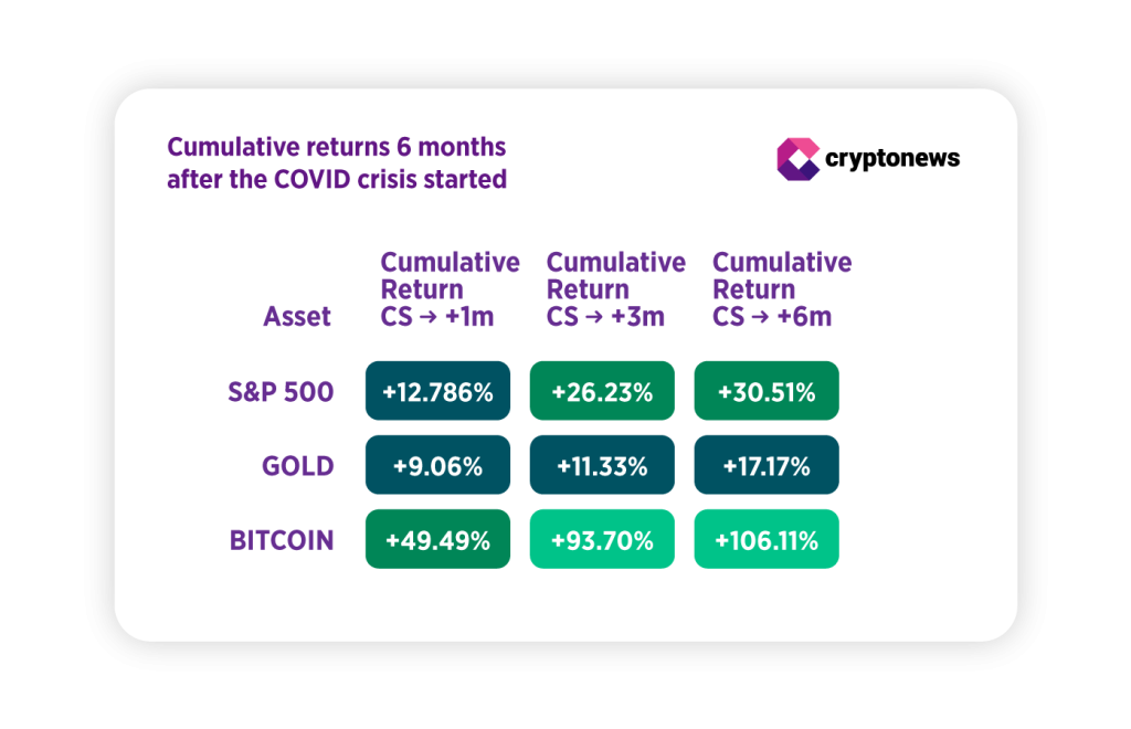 The table below shows the performance of the S&P 500, Bitcoin, and gold — how many days they took to recover to their February–March 12 level, and their cumulative returns one, three, and six months after the market bottom.