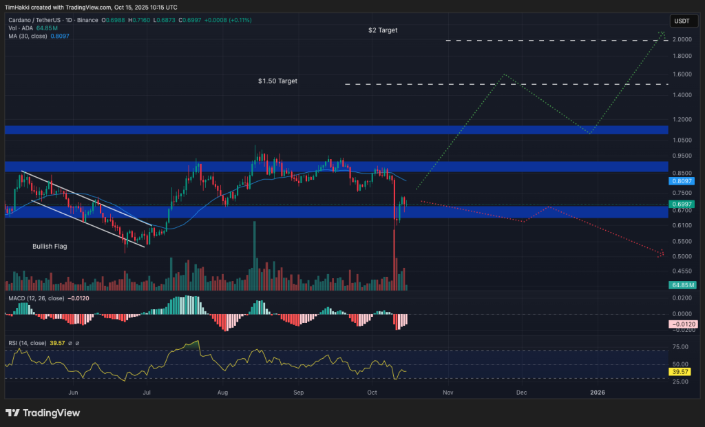 Trading near $0.6993, ADA jumped 4% in the last 24 hours, indicating strong post-crash accumulation. Under favorable macroeconomic conditions, ADA may see $1.50 by autumn and possibly retest its $3.09 ATH by year-end.