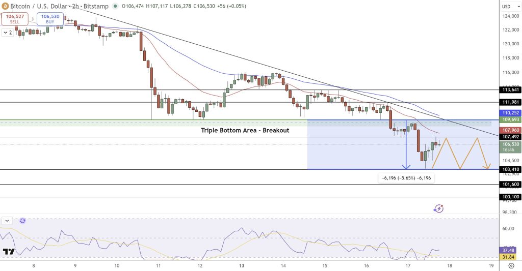 Bitcoin is trading near $106,530, consolidating after testing key support between $103,400 and $104,000. The 2-hour chart suggests a triple bottom pattern, often signaling a bullish reversal if confirmed by a neckline breakout near $107,960.