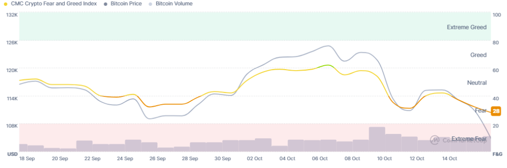 The crypto market has decreased over the past day, and the stock market saw a drop during work hours on Thursday. By the closing time on 16 October, the S&P 500 was down by 0.63%, the Nasdaq-100 decreased by 0.36%, and the Dow Jones Industrial Average fell by 0.65%. This comes as bond yields fell to their lowest level since April, gold set its latest ATH, and regional bank shares came under pressure.