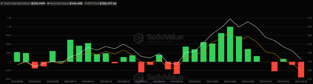 The US BTC spot exchange-traded funds (ETFs) saw notable negative flows on Thursday, with $536.44 million leaving the funds.