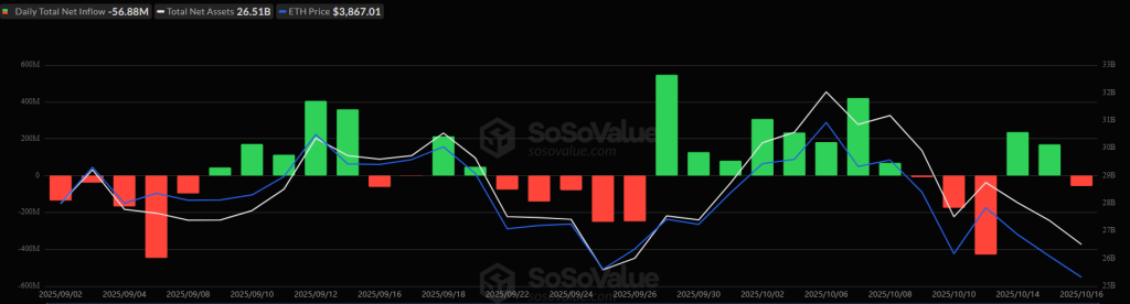 Furthermore, the US ETH ETFs recorded $56.99 million in outflows on 16 October, breaking a very break inflow streak.