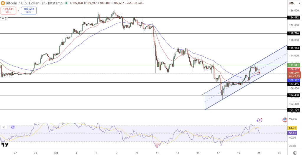 Bitcoin is trading near $109,550, up 1.48% in the past 24 hours, holding firm inside an ascending channel on the 2-hour chart. The pattern reflects a controlled recovery after the mid-October dip, with the 20-EMA crossing above the 50-EMA, an early sign of renewed momentum.