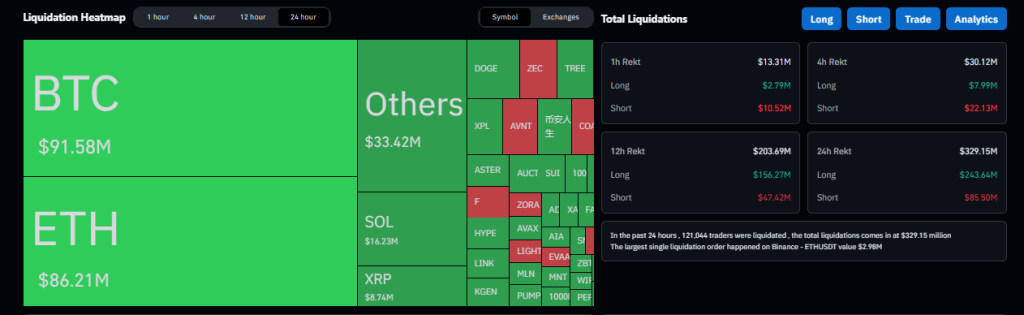 According to data from CoinGlass, over $329.29M in crypto positions were liquidated within the past 24 hours.