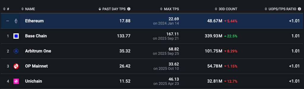 Base offers cheaper and faster transactions on average – reaching speeds of up to 167 transactions per second – compared to Arbitrum or OP Mainnet, along with a smoother user experience that has helped accelerate its ecosystem expansion.