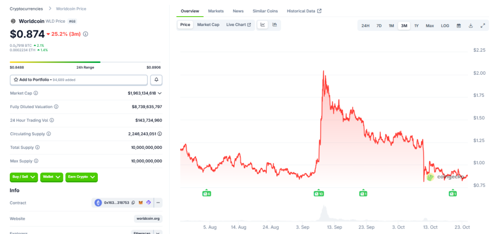 Still, Worldcoin’s token has struggled to maintain market confidence amid ongoing legal challenges. WLD, which once traded as high as $11.74 in March 2024, currently hovers around $0.88, down over 90% from its peak.