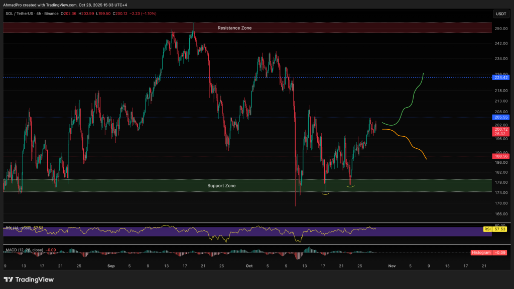 Solana’s price successfully tagged the upper resistance at 205 dollars before pulling back to retest the previous resistance at 197, which has now flipped into support. The Price is currently trading just above that support and below the nearby resistance zone, forming a balanced consolidation setup.