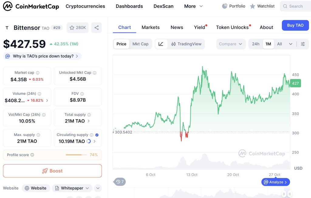 Bittensor’s native token, TAO, is up 42.35% over the past month, trading at $427.59 according to CoinMarketCap. The AI-powered decentralized network continues to attract strong investor interest amid growing enthusiasm for crypto projects merging artificial intelligence and blockchain.