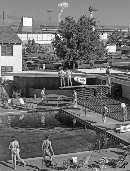 Guests at the Last Frontier watch a mushroom cloud from a nuclear test, at the top of the photo, in 1953. (Image: Las Vegas News Bureau)