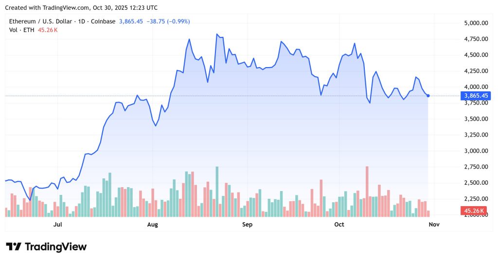 Meanwhile, Ethereum trades at $3,865, down 0.99% in the past 24 hours. The coin has been hovering near the $3,850–$3,900 zone after slipping from its weekly high near $4,100.