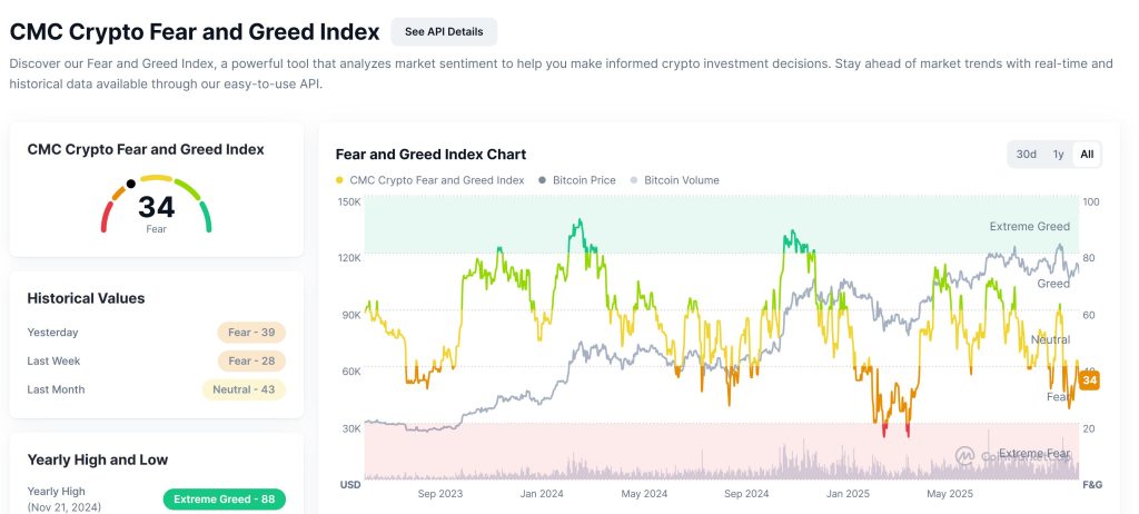 Meanwhile, market sentiment has tilted slightly more bearish, with the Crypto Fear and Greed Index falling to 34, signaling “Fear.”