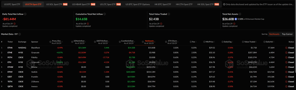 The US Ethereum spot ETFs also recorded $81.44 million in outflows on Wednesday. The total cumulative net inflow now stands at $14.65 billion, while total net assets are valued at $26.60 billion, representing 5.58% of Ethereum’s market capitalization.