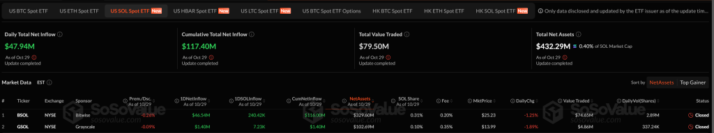 Among the two listed ETFs, Bitwise’s BSOL led with $46.54 million in inflows, while Grayscale’s GSOL added $1.40 million. Total trading volume across both funds was $79.50 million for the day.