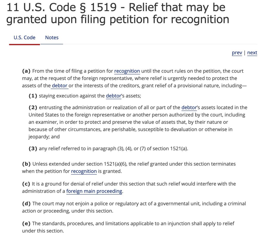 The order, issued under Section 1519 of the U.S. Bankruptcy Code, allows temporary relief before a foreign case receives formal recognition under Chapter 15, the framework that governs cooperation between U.S. courts and foreign insolvency proceedings.